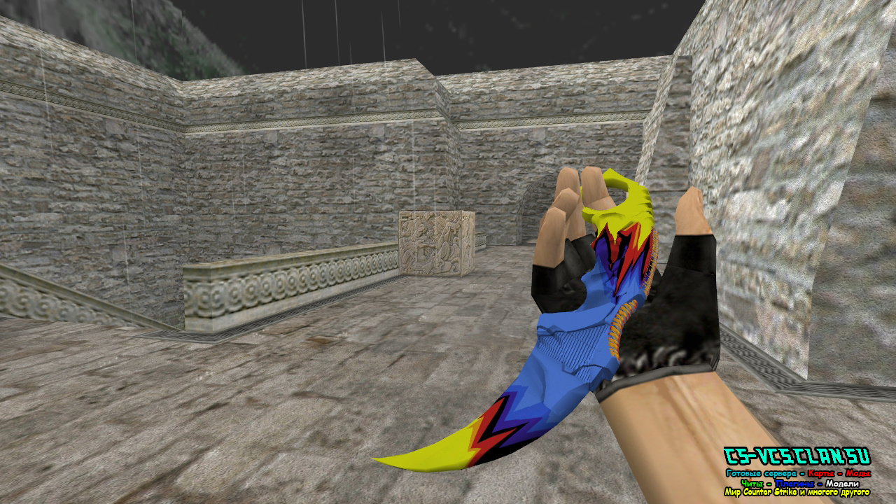 Красочная и очень красивая модель ножа «Karambit | Discontinuity» для CS 1.6. Как Вы могли уже заметить, нож сделан в различных ярких цветах, а именно в желтом, голубом, черном, красном, фиолетовом и синим. Смотрится скин достаточно привлекательно и жизнерадостно.